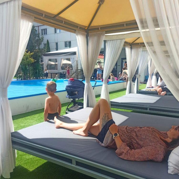 • Ogród hotelowy z atrakcjami wodnymi dla dzieci, loże z baldachimem
